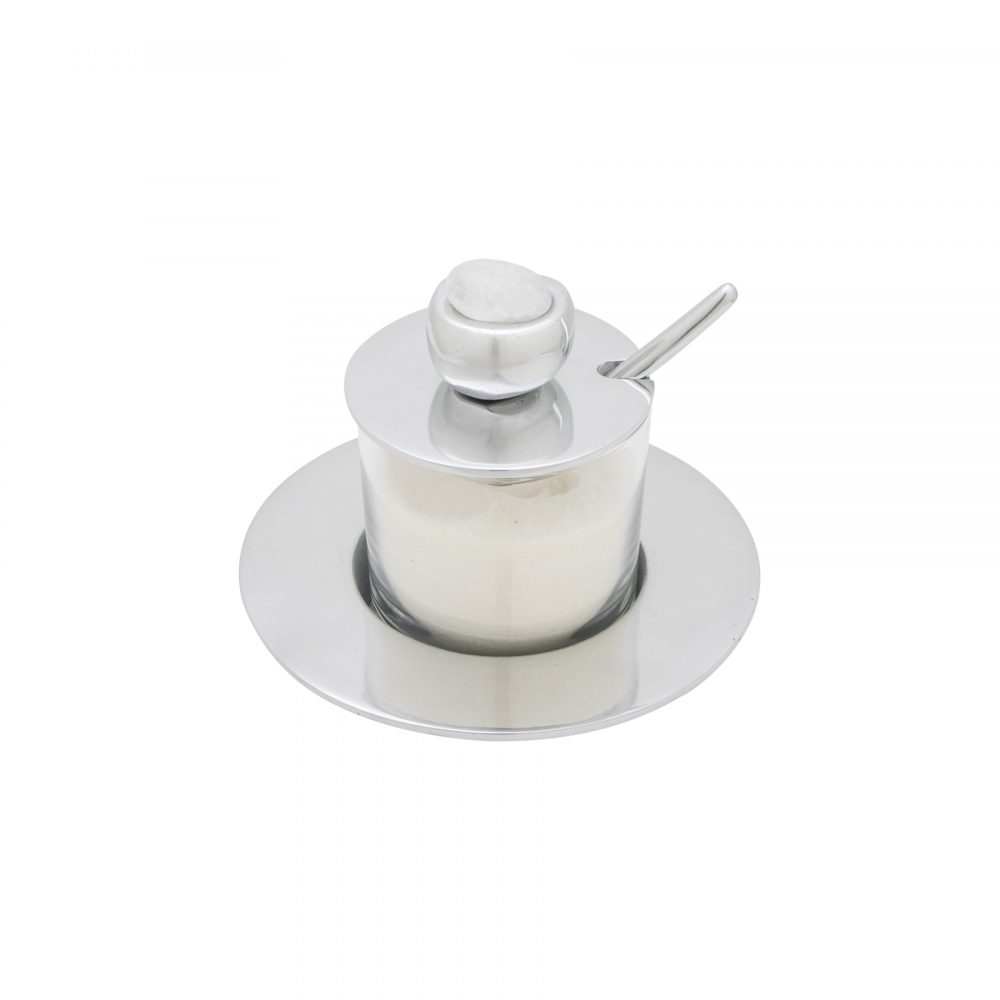 Açucareiro lindo e delicado com base, tampa e colher em alumínio fundido, com copo em vidro. Aplique com pedra brasileira branca. Peça feita a mão pela designer Solange Lopes. As peças não podem ser lavadas na máquina de lavar louça, utilize apenas esponja macia, água e detergente.