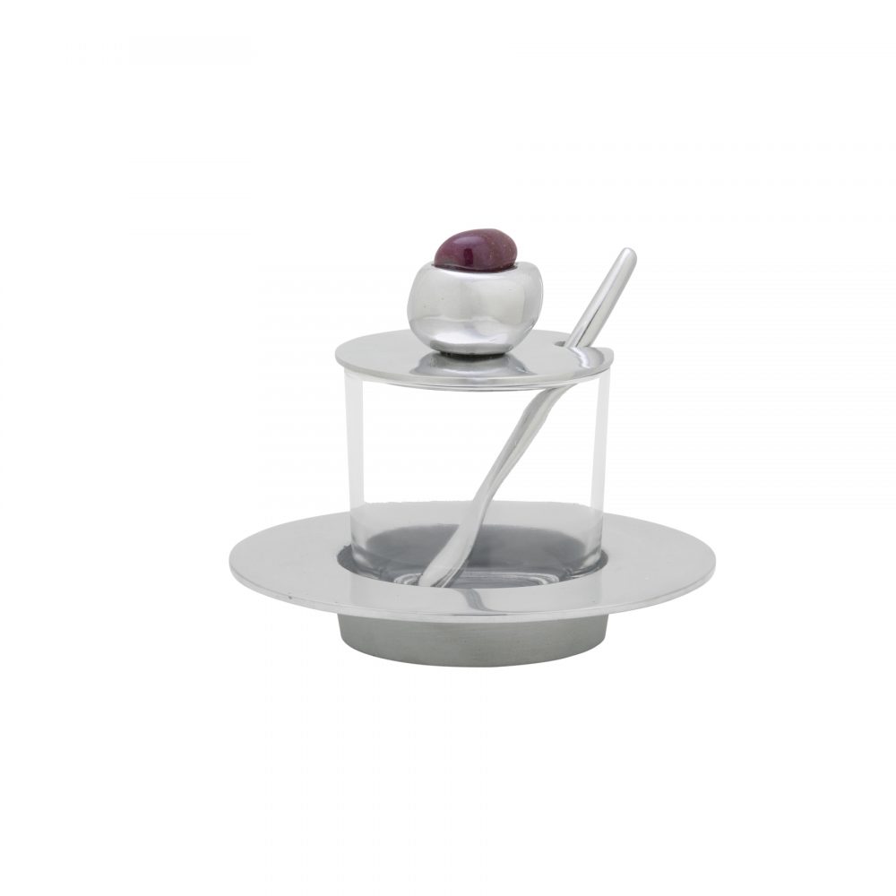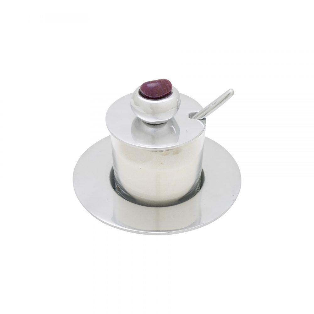 Açucareiro lindo e delicado com base, tampa e colher em alumínio fundido, com copo em vidro. Aplique com pedra brasileira rosa. Peça feita a mão pela designer Solange Lopes. As peças não podem ser lavadas na máquina de lavar louça, utilize apenas esponja macia, água e detergente.