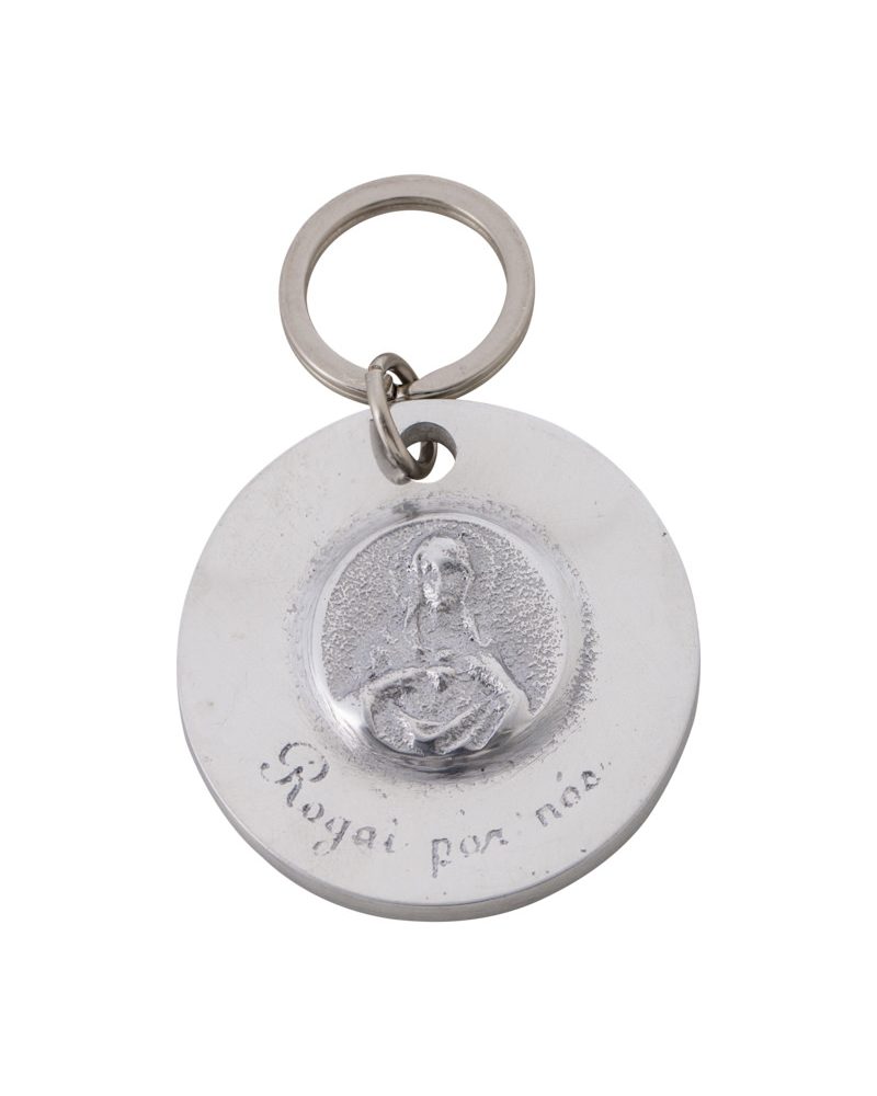 Chaveiro em alumínio fundido com imagem de Jesus e gravação da frase: ” Rogai por nós”.