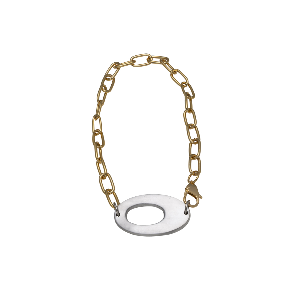 Choker ajustável com corrente banhada em ouro amarelo e medalha vazada em formato oval, em alumínio fundido. Peça assinada pela designer Solange Lopes.