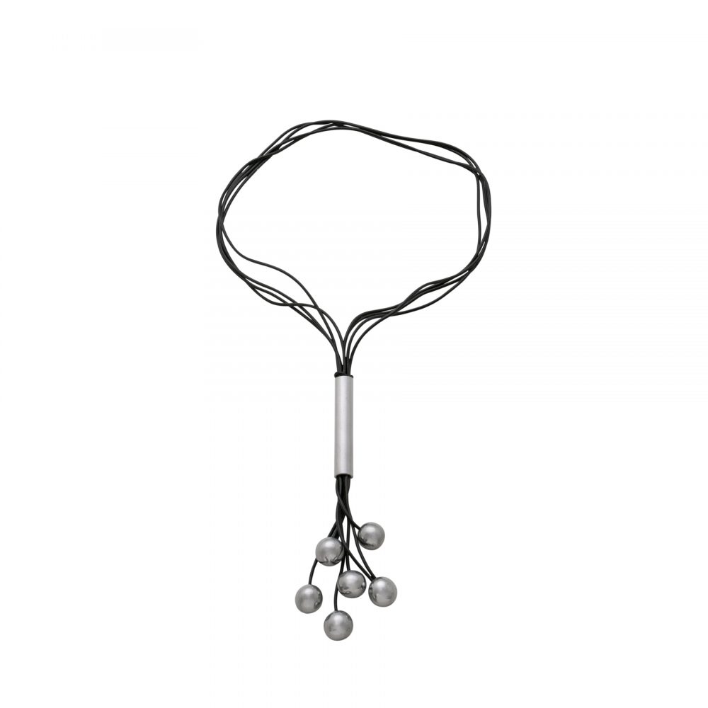 Colar longo com fios de couro preto no modelo gravata. Pingentes (6) no formato de esferas em alumínio fundido. Colar feito a mão pela designer Solange Lopes. Não passar nenhum produto abrasivo nas peças de alumínio, apenas lave com água, detergente e esponja macia.
