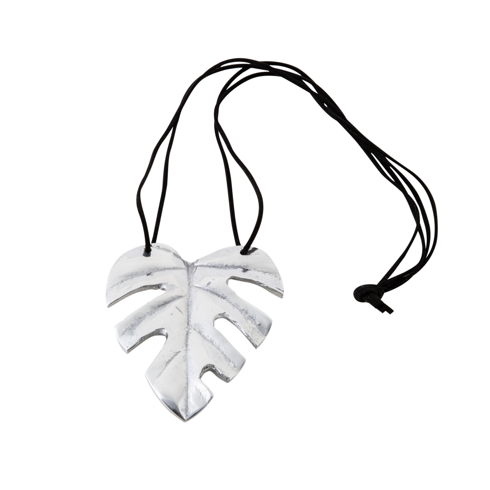 Colar com cordão em camurça preta ou natural, com folha costela de Adão em alumínio fundido. O cordão pode ser regulado de acordo com sua altura. o alumínio não escurece e para limpar a peça basta retirar o cordão, lavar com água e detergente neutro! Peça assinada pela designer Solange Lopes.