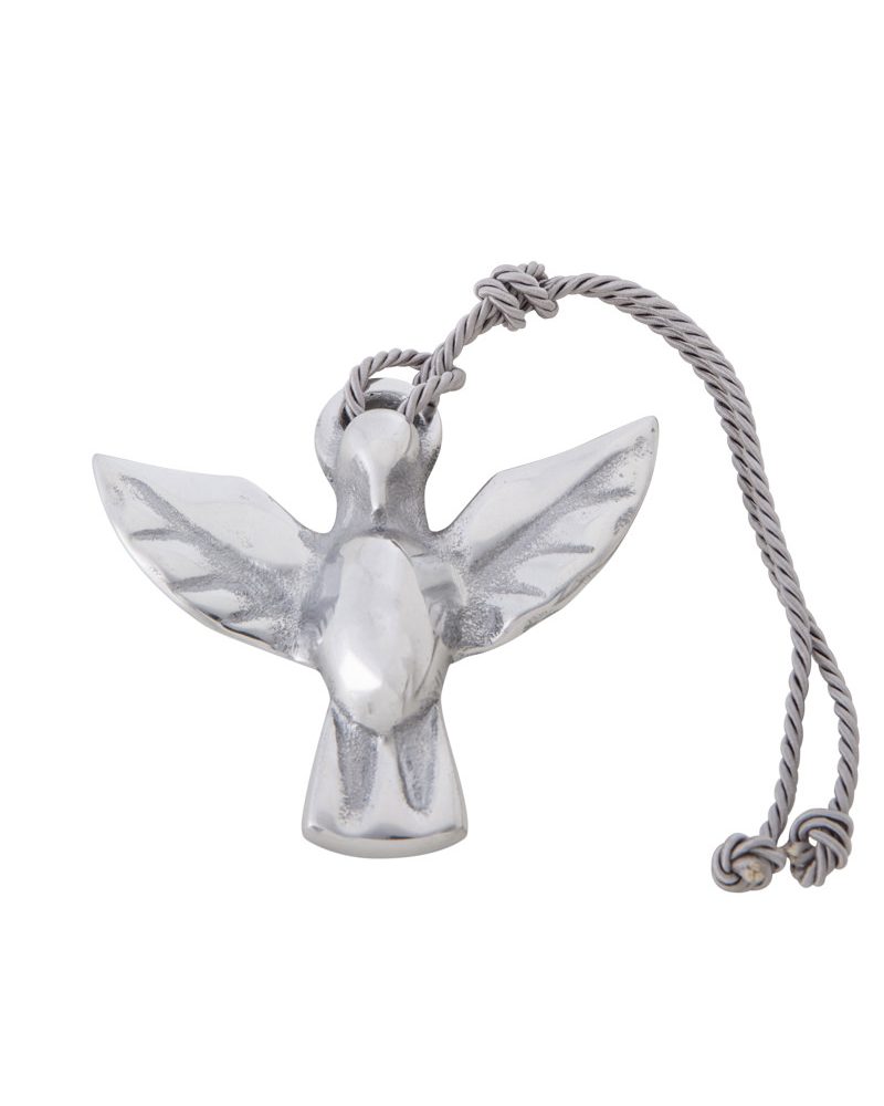 Espírito Santo em alumínio fundido com cordão cinza chumbo.  Pode ser pendurada em paredes, cabeceiras de cama, portas ou ainda colocada deitada em mesas de centro ou mesas laterais! Use sua criatividade! E crie seu cantinho especial de oração! Esta peça é assinada pela designer Solange Lopes.