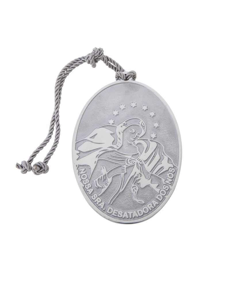 Medalha decorativa em alumínio fundido com imagem de Nossa Senhora Desatadora dos Nós e cordão cinza. Esta medalha pode ser pendurada em paredes, cabeceiras de cama, portas ou ainda colocada deitada em mesas de centro ou mesas laterais! Use sua criatividade! E crie seu cantinho especial de oração! Esta peça é assinada pela designer Solange Lopes.