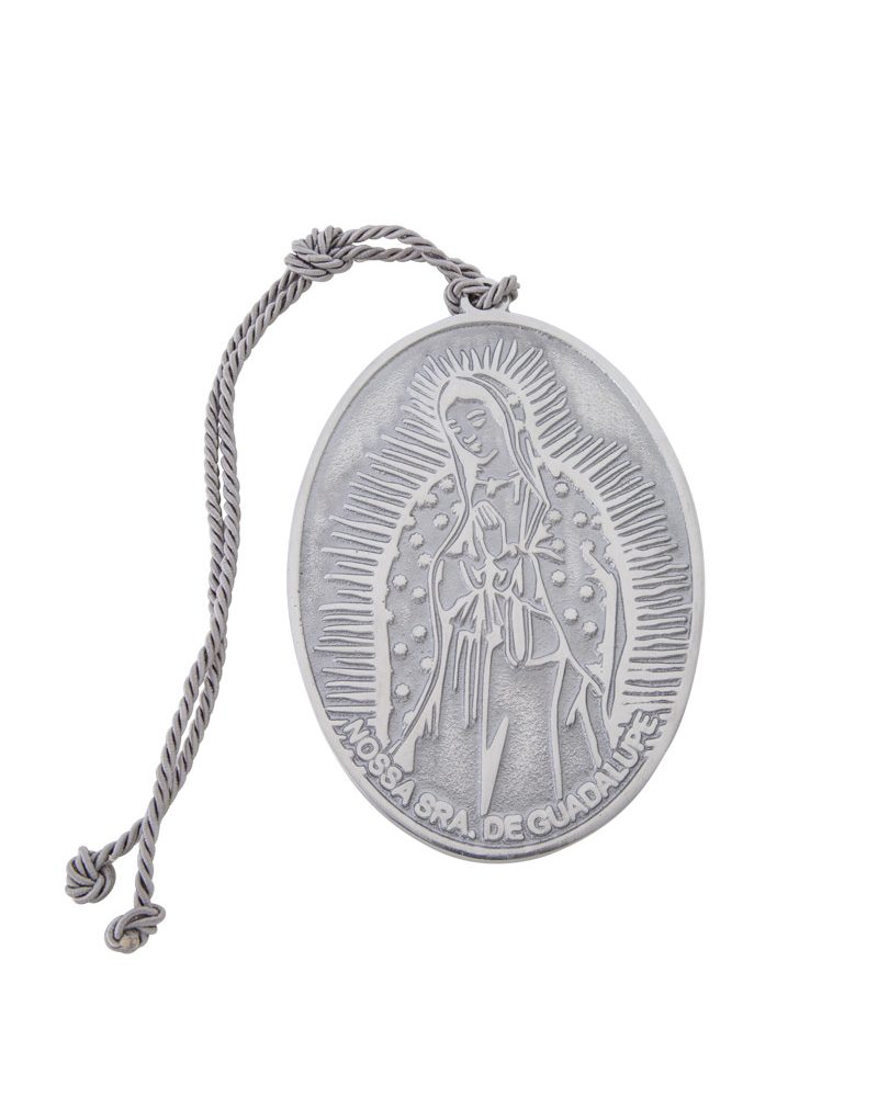 Medalha decorativa em alumínio fundido com cordão cinza chumbo e com a imagem de Nossa Senhora de Guadalupe. Esta medalha pode ser pendurada em paredes, cabeceiras de cama, portas ou ainda colocada deitada em mesas de centro ou mesas laterais! Use sua criatividade! E crie seu cantinho especial de oração! Esta peça é assinada pela designer Solange Lopes.
