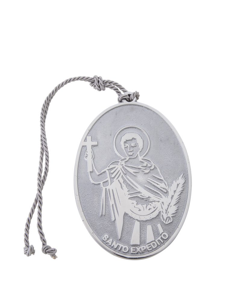Medalha decorativa em alumínio fundido com imagem de Santo Expedito e cordão cinza. Esta medalha pode ser pendurada em paredes, cabeceiras de cama, portas ou ainda colocada deitada em mesas de centro ou mesas laterais! Use sua criatividade! E crie seu cantinho especial de oração! Esta peça é assinada pela designer Solange Lopes.