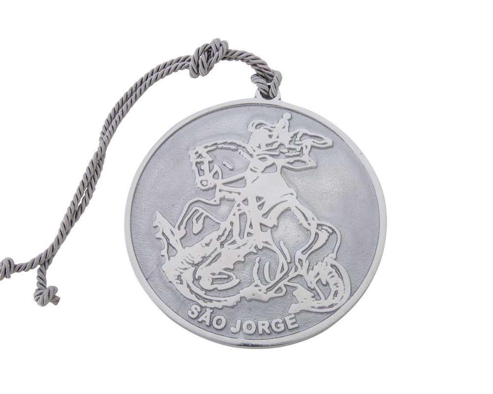 Medalha em alumínio fundido com a imagem de São Jorge em seu cavalo, com cordão cinza chumbo. Esta medalha pode ser pendurada em paredes, cabeceiras de cama, portas ou ainda colocada deitada em mesas de centro ou mesas laterais! Use sua criatividade! E crie seu cantinho especial de oração! Esta peça é assinada pela designer Solange Lopes.