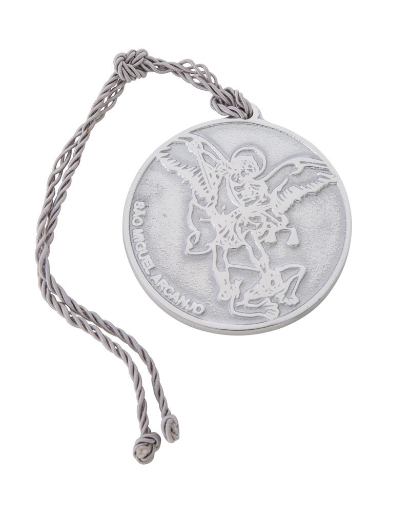 Medalha em alumínio fundido com a imagem de São Miguel Arcanjo e com cordão cinza chumbo. Esta medalha pode ser pendurada em paredes, cabeceiras de cama, do lado de fora de berços, portas ou ainda colocada deitada em mesas de centro ou mesas laterais! Use sua criatividade! E crie seu cantinho especial de oração! Esta peça é assinada pela designer Solange Lopes.