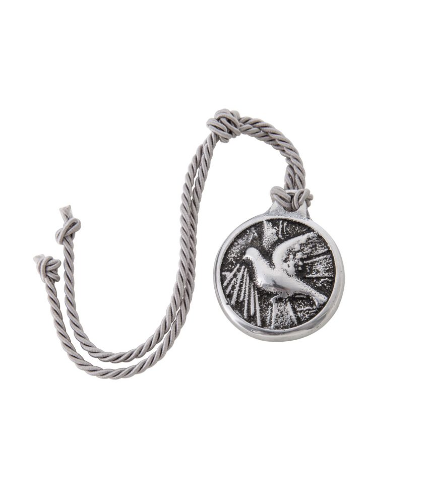 Mini medalha em alumínio fundido com imagem do Espírito Santo e cordão cinza. Linda opção para lembrança de batizado, nascimento ou primeira comunhão!