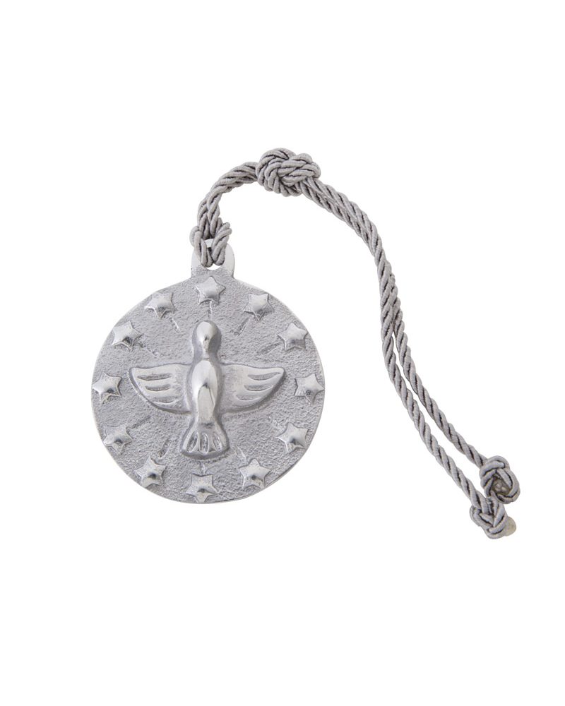 Mini medalha em alumínio fundido com imagem do Espírito Santo, estrelas em alto relevo e cordão cinza.