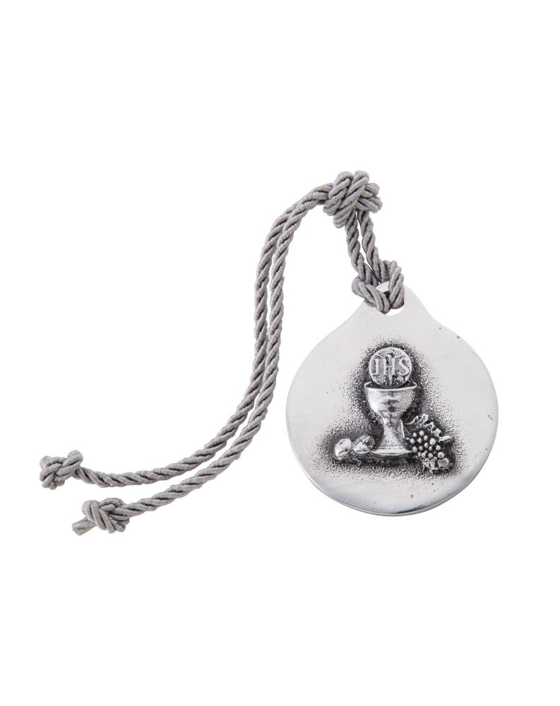 Mini medalha em alumínio fundido com o símbolo da Eucaristia e com cordão cinza. Uma linda opção para dar de lembrança em primeira Eucaristia e comunhão.